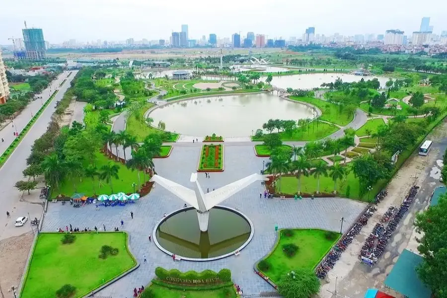 - 広さ・内部構造・設備: 面積は約20ヘクタールとハノイ市内有数の広大さで、整備費に約2兆8200億ドン(約150億円)が投じられた近代的な公園です。園内は大きく分けて、中央の調整池(ホーディエウホア)と呼ばれる湖、水辺を囲む芝生広場、子供の遊び場、そして各種スポーツ施設ゾーンに分かれます。湖のほとりには噴水や日本の平和公園を模した記念碑など独創的な建築モニュメントが配置され、上空から見ると湖と門が組み合わさって「No War」という平和メッセージを描くデザインになっています。子供向けにはブランコやシーソーを備えたプレイグラウンドがあり、訪れた幼児たちが安全に遊べるようクッション舗装も施されています。スポーツ設備も充実しており、園内にはバドミントンコート、テニスコート、フットサル場、バスケットコートまで整備され、予約不要で自由に利用できます。さらに園内の各所にジョギングや自転車用の広い園路が巡らされ、健康器具も点在しています。ベンチや東屋、清潔な公衆トイレやゴミ箱も随所に配置され、快適性に配慮された造りです。大規模公園らしくイベント広場も備え、フードフェスや文化交流会など市主催の野外イベントが開かれることもあります。