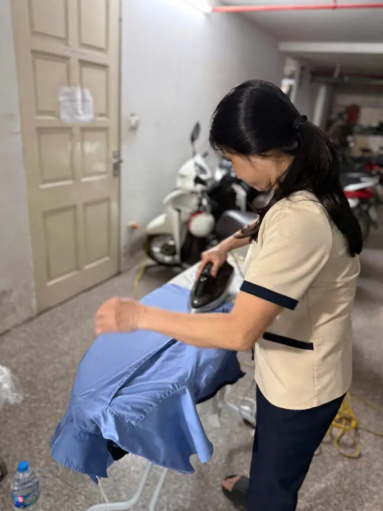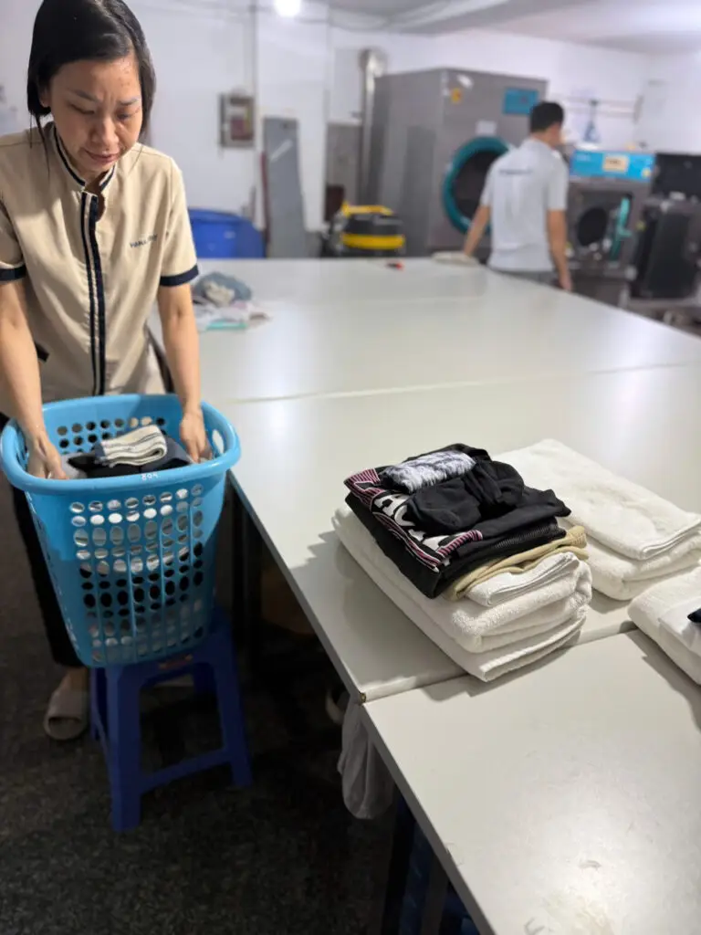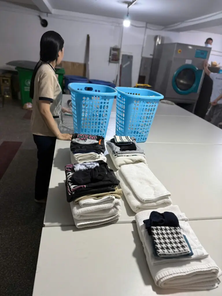朝7時30分、ハウスキーパーさんの一日が始まります。最初の仕事は洗濯の回収。入居者さんが朝6時くらいから9時くらいにかけて出勤するので、お部屋の洗濯物カゴの回収から始まります。回収した衣類にタグを付けて仕分けをし、洗濯機に投入します。洗濯の担当者がテキパキを仕分けをして、色落ちしないか、ポケットに物が入っていないか、衣類の破損やほつれが無いか確認して順番に洗濯機に入れていきます。洗濯が終わったら乾燥機へ移し、その後アイロンがけも丁寧に行います。シャツやハンカチはシワ一つない状態にアイロンをかけ、パリっと仕上げます。乾燥機で仕上げた服は元の場所にきちんと返却。誰のものか分かるようにタグ付けしていたので、取り違えの心配もありません。