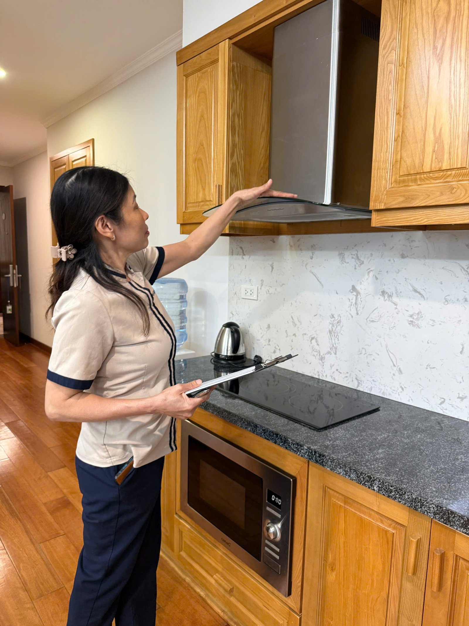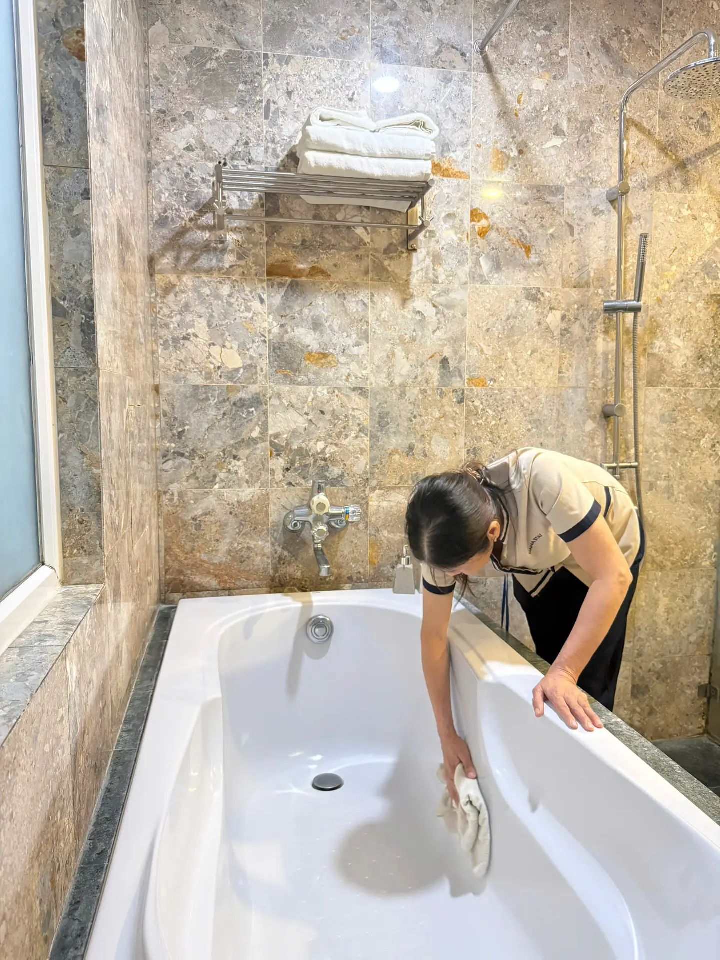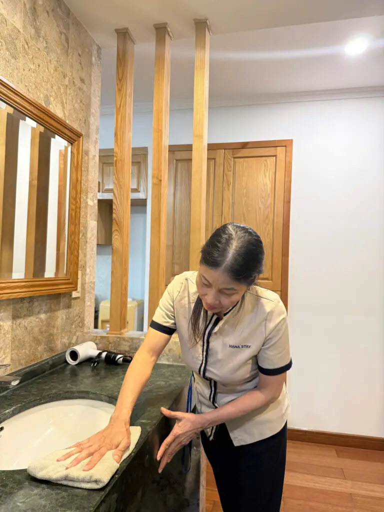 一通りの清掃が終わったら、ハウスキーパー同士でダブルチェックを行います。2人一組で作業することもあり、お互いの仕上がりを確認し合います。リビング、キッチン、ベッドルーム、浴室と、それぞれの部屋をもう一度見回して作業の漏れがないか確認します。「テーブルの上に拭き残しはないかな?」「ゴミの捨て忘れはない?」といった具合にチェックリストを頭の中でなぞりながら点検。2人で清掃している場合は、チームで分担しながら最終確認までしっかり行います。こうしてダブルチェックを終えると、時間はちょうど16時30分。今日のハウスキーパー業務は終了です!