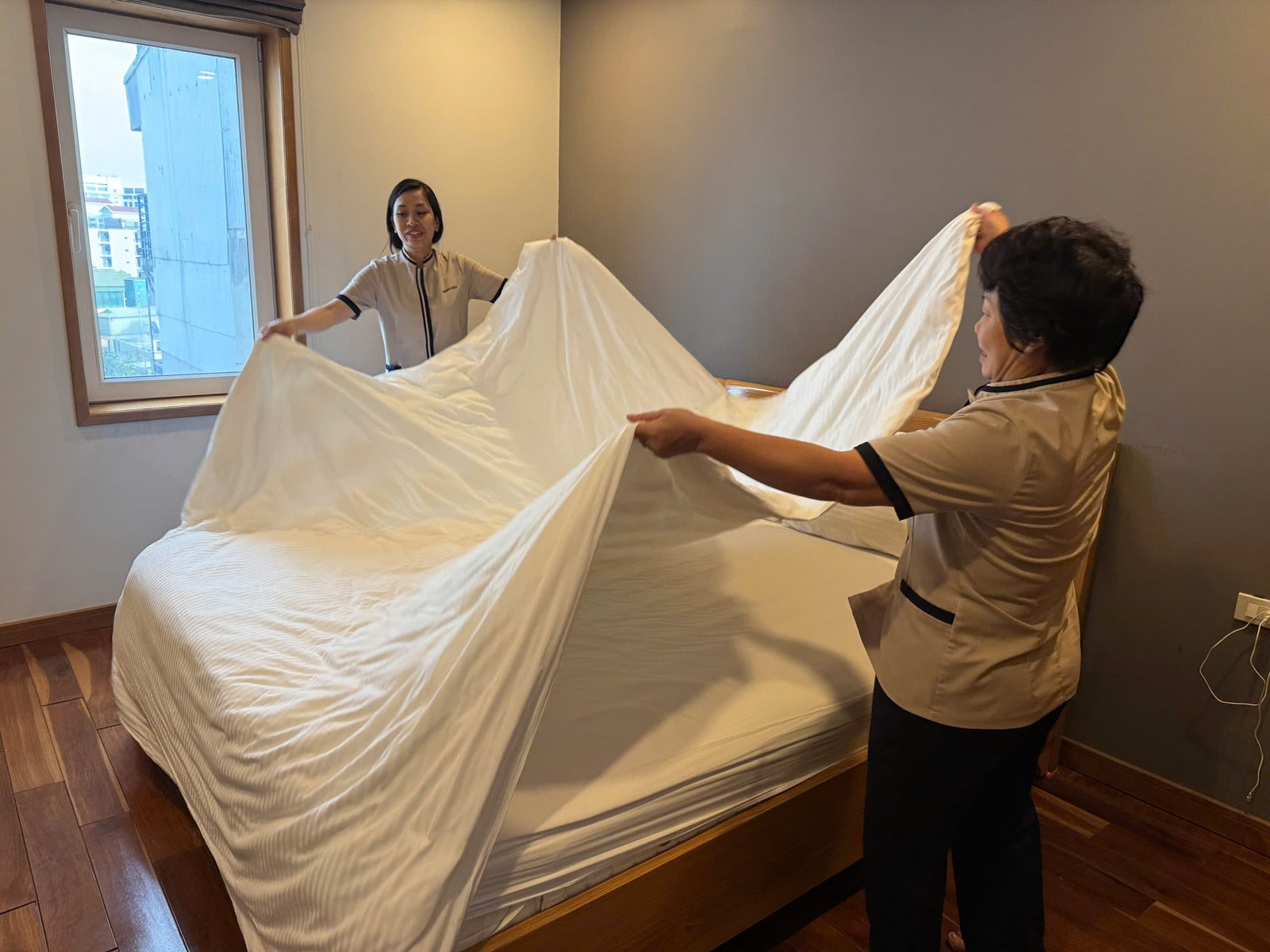 最後の仕上げにベッドメイキングを行います。寝室に移動し、シーツや布団カバーを整えましょう。毎日ベッドカバーをピシっと直し、枕元も整頓します。そして週に一度はシーツ類のリネン交換日があります。ハウスキーパーさんはテキパキとシーツを外し、清潔なものに交換していきます。シーツは大きく広げてシワを伸ばしながらベッドにセット!新しいシーツはパリっとしていて気持ちいいですね。布団も形を整えて、ホテルとメイクと変わらず、美しくベッドメイク完了です。「入居者さんが疲れて帰ってきたとき、ふかふかベッドでぐっすり眠ってもらえたら嬉しいです」と、ハウスキーパーさんもやりがいを感じているそうですよ。
