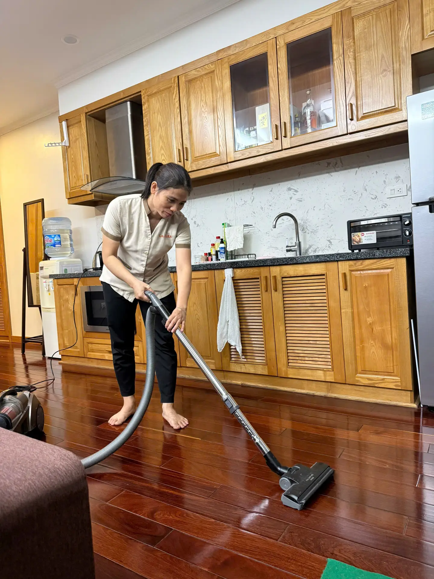 洗濯をしている間に、次はリビングとキッチンの清掃に取りかかります。まずは掃除機を使ったお掃除から!リビングの床やラグの上を掃除機でしっかりほこり取りします。業務用のパワフルな掃除機で、ソファの下や部屋の隅までスイスイーっとかけていきます。窓から差し込む朝日で舞うほこりも、これで一網打尽。フローリングの目の中や、キッチンの床にも掃除機をかけ、ゴミをしっかり吸い取ります。ハウスキーパーさんは普段見落としがちな隙間まで掃除機を当てていて、「さすがプロだなぁ」と感心しちゃいます。