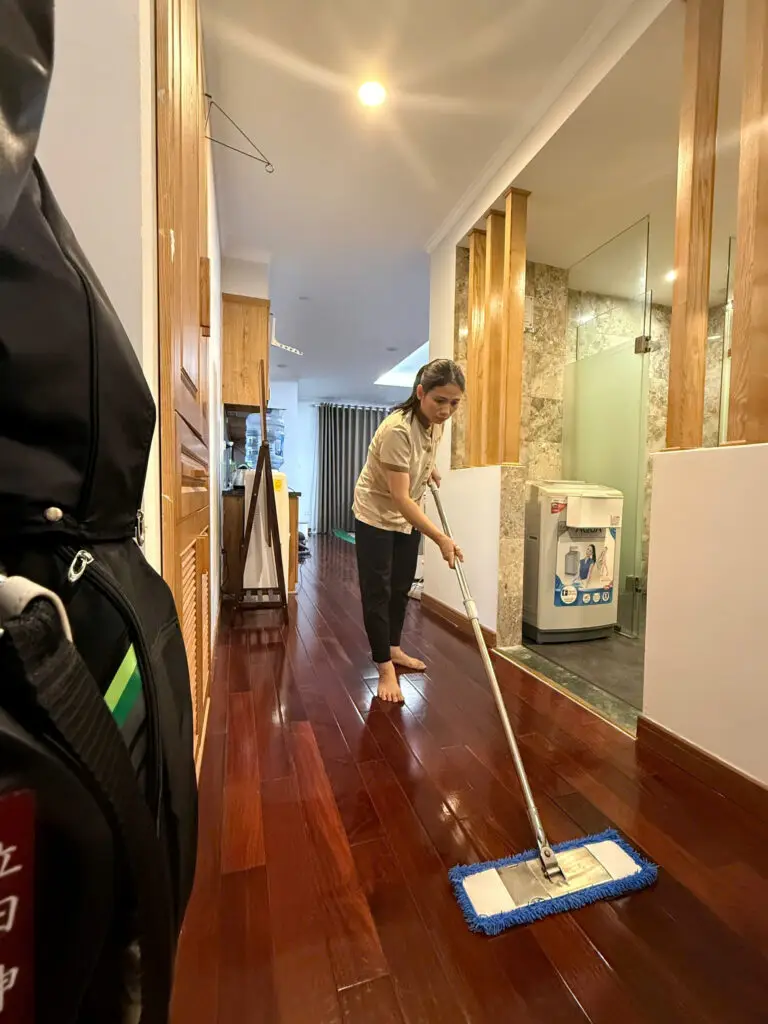掃除機がけが終わったら、拭き掃除に移ります。写真ではモップを使っていますが、モップや雑巾で床をピカピカに拭いていきます。リビングのテーブルや棚、テレビ台の上も、乾いた布でほこりをはらった後、固く絞った雑巾でサッと拭き掃除。テーブルの上も丁寧に拭いてツヤツヤに!キッチンカウンターやダイニングテーブルも同様に拭き上げます。ハウスキーパーさんは「手アカや水滴の跡も見逃しませんよ」と笑顔でひと拭き。リビングとキッチンがみるみる綺麗になっていき、現場には爽やかな清潔感が広がります。