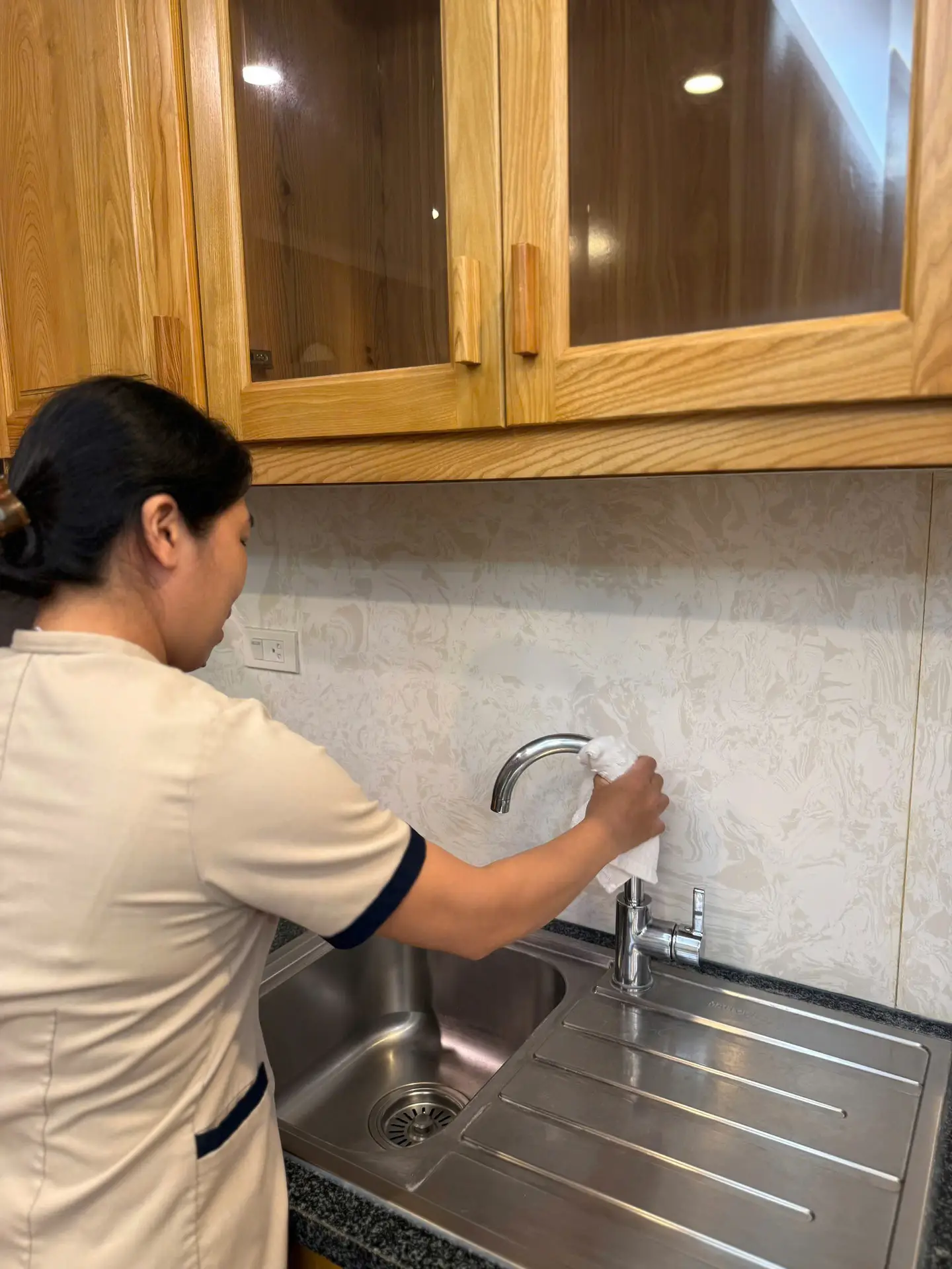 リビング・キッチンの床掃除が終わったら、続いてキッチンの流し台をチェックします。写真のようにシンクに洗剤を吹きかけ、スポンジでゴシゴシと洗い流します。シンクのステンレス部分は水垢が残りやすいですが、ハウスキーパーさんはピカピカになるまで磨いてくれます。流し台に食器の洗い物が残っている場合も安心。お皿やコップはすべて丁寧に洗って、水切りラックに並べておいてくれます。ただし、飲みかけのコップやペットボトルが置いてあった場合は要注意。ハウスキーパーさんは「これは入居者さんが後で飲むかもしれない」と判断し、飲みかけのものには手を付けないんです。うっかり捨ててしまわないようにとの心遣いですね。このように、キッチン周りもスッキリ清潔にしていきます。